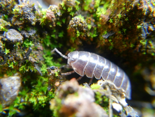 ワラジムシは湿った土の上や落ち葉の下などに生息している生き物で、甲殻類の一種。実は昆虫よりはエビやカニに近い仲間です。
