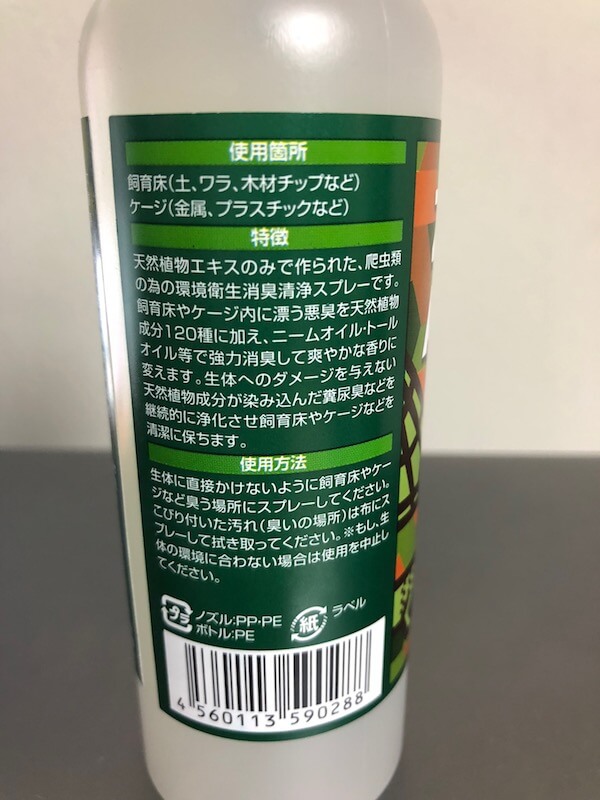 消臭力が高く、コオロギなどのケースにも使用できる生体や環境に優しい消臭剤です。
