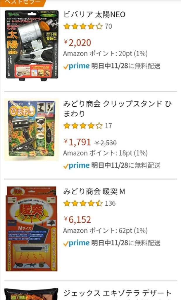 爬虫類用品価格を販売元ごとに並べると、概ね以下のような順番になります。
