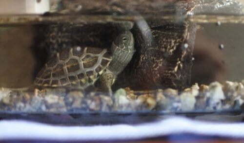 - 水深の浅い水槽でカメを飼育している